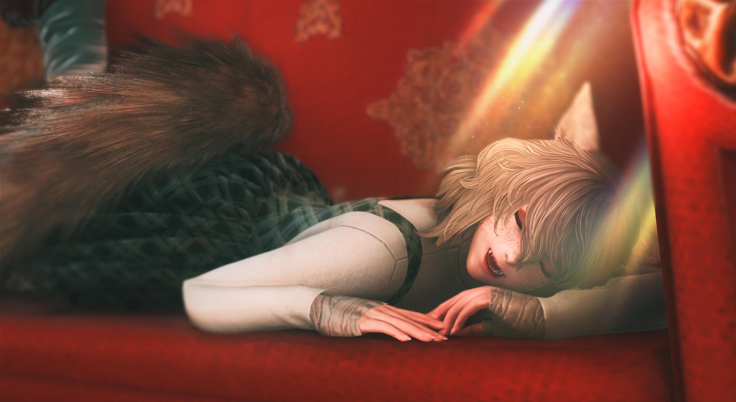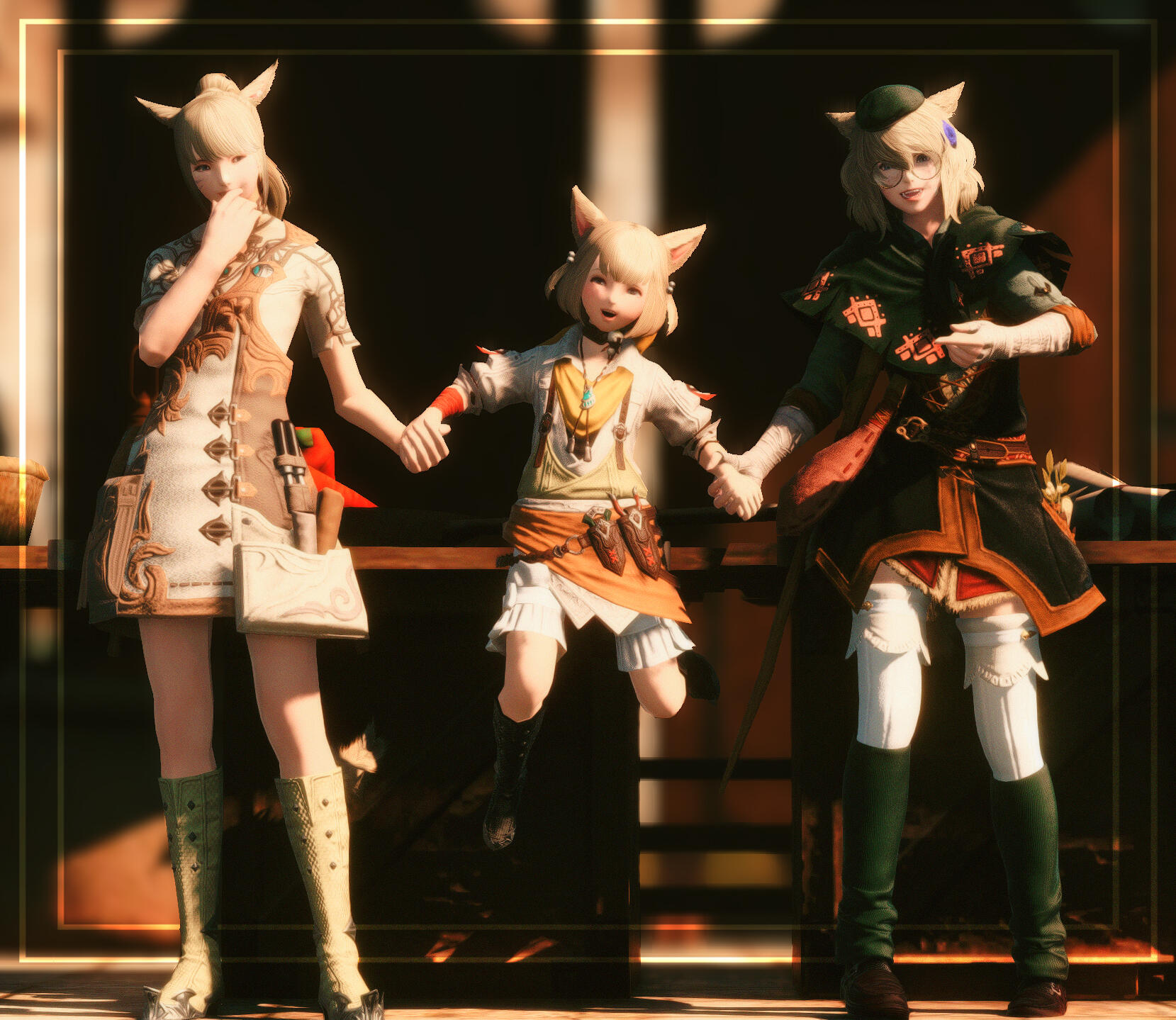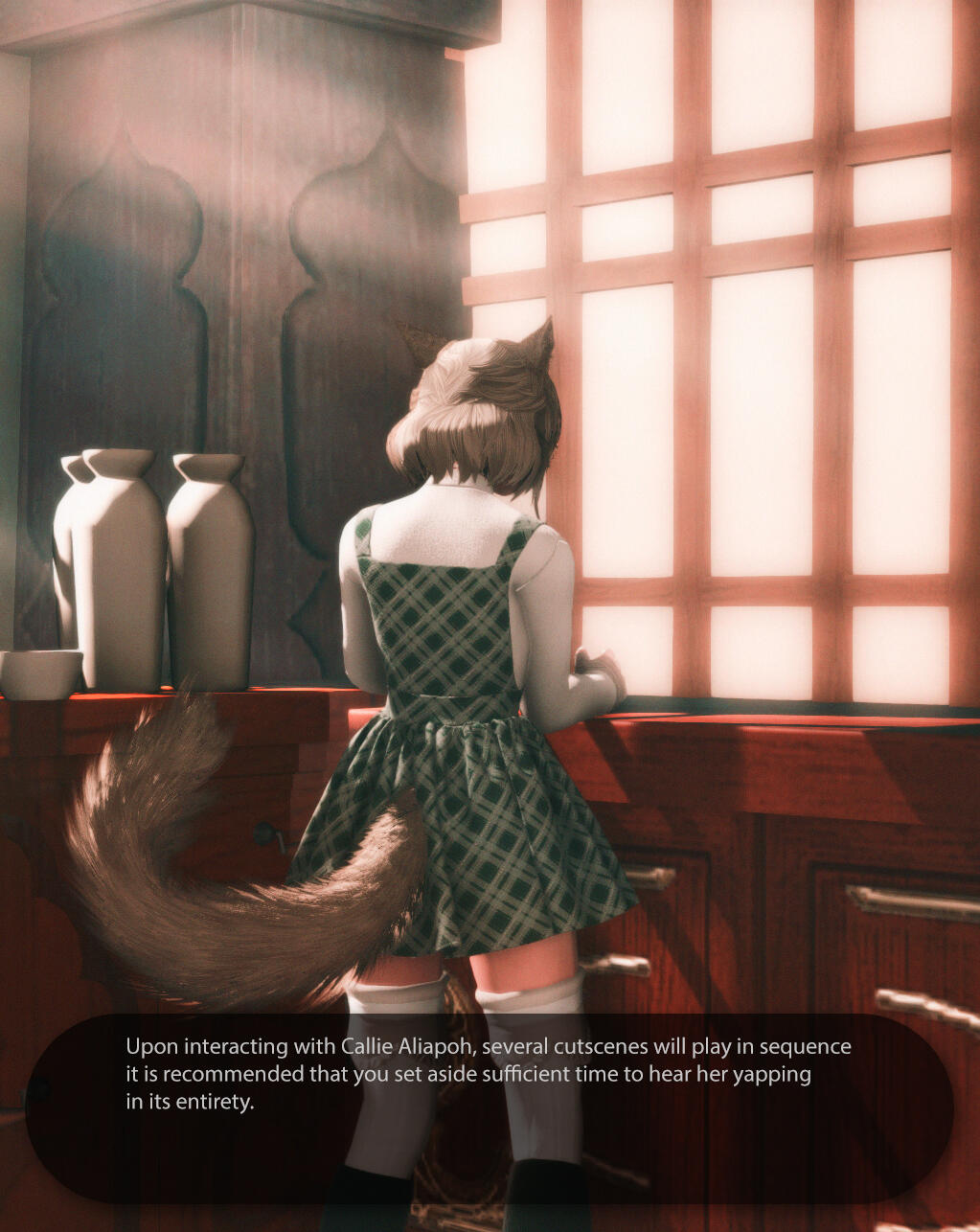 The middle sibling of the Aliapoh litter, Callie was separated from her family during the Calamity.Callie found her way to the Botanist's Guild dishevelled, injured, & starving inside a box of collectibles, Guildmaster Fufucha took in Callie as her own.